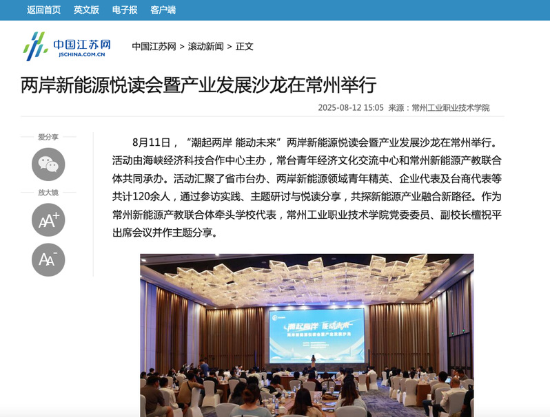 中国江苏网:两岸新能源悦读会暨产业发展沙龙在常州举行