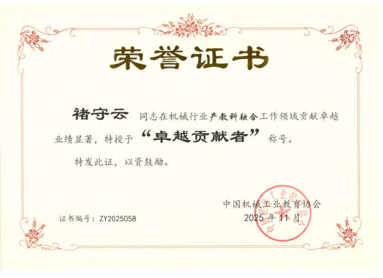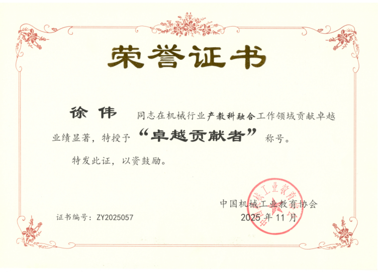 近日,在中国机械工业教育协会组织的机械行业产教科融合高质量发展评选中,我校褚守云、徐伟两位教授凭借在产教融合领域的深耕实践与突出成就,荣获机械行业产教科融合工作“卓越贡献者”称号,为我校高水平建设再添重要荣誉。